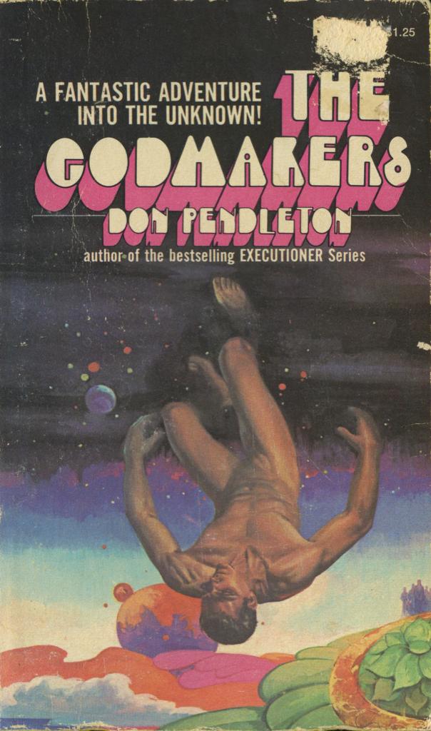 Don Pendleton published innumerable books before he found fame and fortune with the Executioner. The Godmakers was one of those early books, published right around the time that Miami Massacre came out. The first edition of the novel carried the “Dan Britain” by-line, a psuedonym Pendleton apparently saved for his sci-fi output. The edition shown here is the 1974 reprint, published under Pendleton’s own name and capitalizing on the mid-‘70s success of the Executioner series, which is name-dropped on the cover…right above the wangless naked dude as he floats through a sort of blacklight-esque dreamspace.