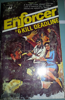 But boy did they screw up with this printing. For one, take a look at that title. They have Kill Deadline as “#6” in the series, when in reality it was #4. I assume Manor was trying to fool people into thinking this was a “new” installment…and also, if you count the Lancer originals that Manor reprinted (Enforcer #1, Calling Doctor Kill, and Kill City), plus the two "new" Manor originals (Bio Blitz and Steel Trap), then this would actually be the sixth volume, at least in order of publication.