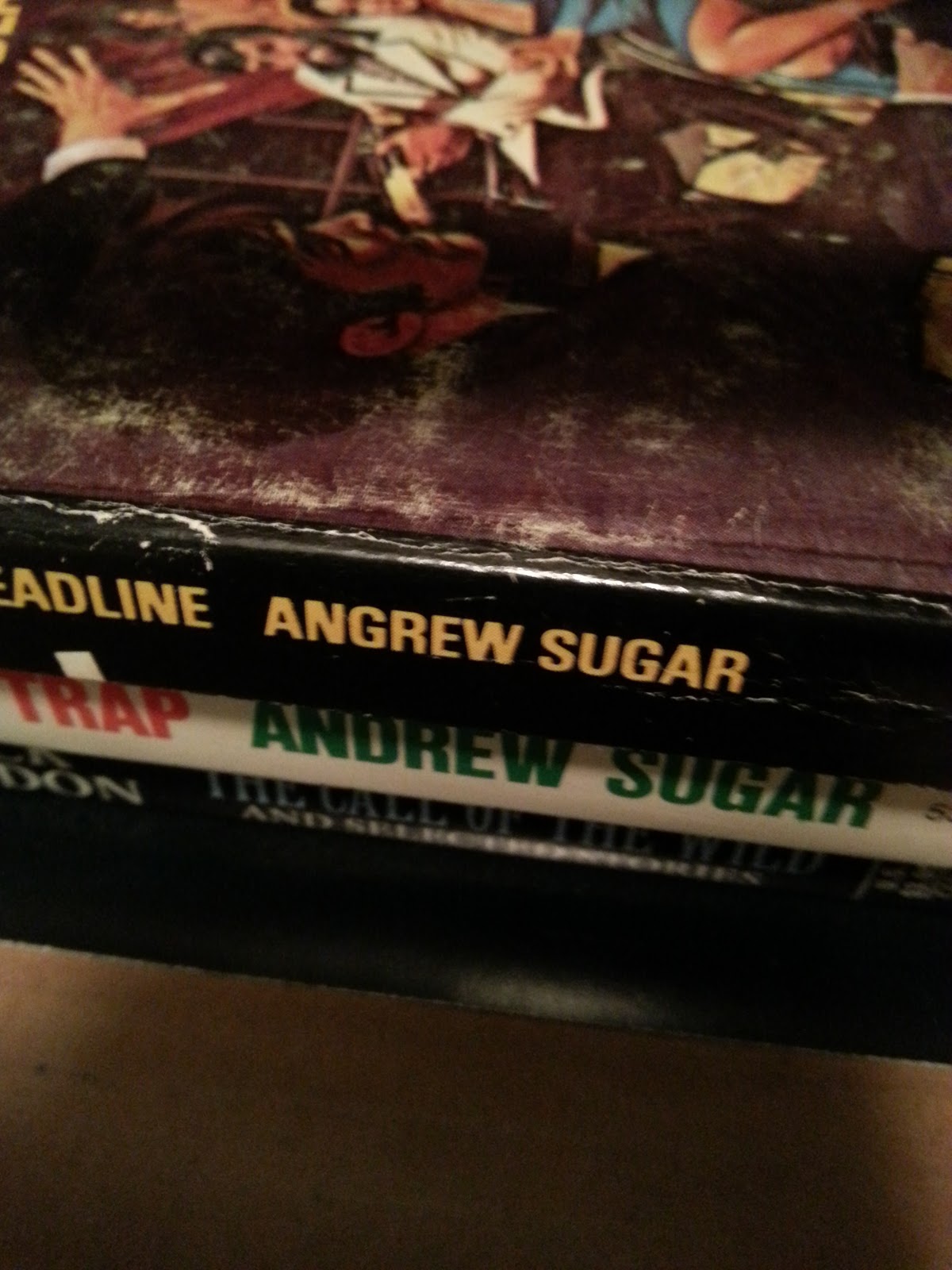 Again looking at the cover, you’ll notice something is missing – namely, a byline for series author Andrew Sugar. Manor only put Sugar’s name on the spine, and even here they goofed: see if you can spot what’s wrong in the picture below: