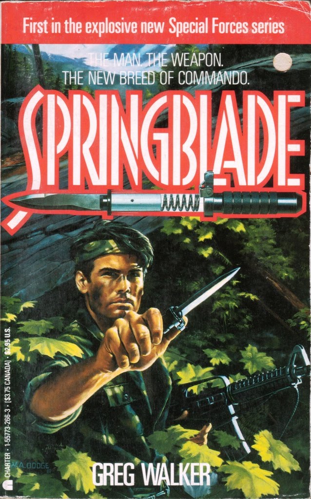 Another indication of the publication date is that much of Springblade #1 veers a little too close to military fiction, at least for my taste. Another thing I preferred about ‘70s men’s adventure was that, for the most part, the protagonists were lone wolves. Teams were all the rage in series fiction in the ‘80s, and as the decade progressed the teams became more and more similar to your average Delta squad or SEAL team.
