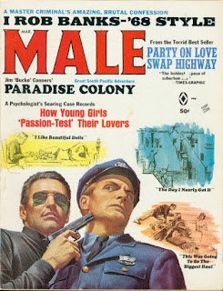 The most interesting thing about The Concrete Cage is where the cover art was sourced from; through a complete fluke I happened to discover that it was taken from the March 1968 issue of the men's adventure magazine Male -- and don’t you love how in the original painting this shades-wearing dude, who on the cover of The Concrete Cage is supposedly Blaze himself, is holding a pistol to the head of a cop?