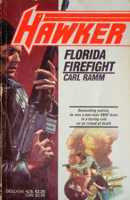 Like most other ‘80s series, Florida Firefight starts off with the hero’s origin story (it seems to me that most men’s adventure series in the ‘70s dispensed with origin stories). We meet tough Chicago cop James Hawker, a 34-year-old SWAT captain, as he’s got a Guatemalan terrorist in his crosshairs. The terrorist has abducted several rich teenagers from a local private school. But instead of blowing away the terrorist, Hawker must wait for confirmation to shoot – political red tape and all the usual stuff.