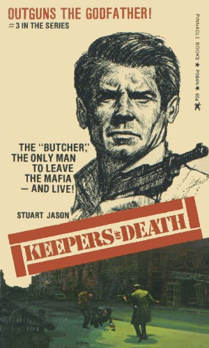 I’ve been sold on this series ever since I read Zwolf’s awesome description: "The bad guys were always comically gruesome fiends, covered with pus-filled warts and such, and so sexually depraved they'd rape a rock heap if they thought there was a snake in it." And he wasn’t exaggerating, as Keepers Of Death opens with our hero, Bucher (aka “The Butcher” to his old Mafia pals), taking out a pair of deformed sadists who are hot on his trail, looking to collect the $100,000 bounty placed on Bucher’s head for being “the only man to leave the Mafia – and live:”