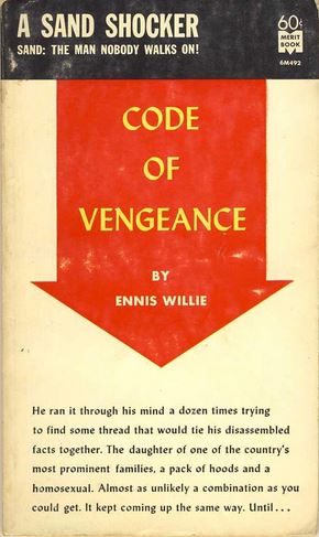During my recent hardboiled pulp kick I’ve been seeing mention of Ennis Willie, an obscure author of the time who is finally getting some attention fifty years after his last book was published. Willie wrote many novels, most of them published by low-circulation sleaze imprint Merit Books, but he’s most known for his series of eight books featuring the character Sand.