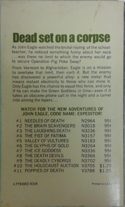 Stokes was 64 when The Green Goddess was published (and would die just five months later, unfortunately), and it’s impressive how this guy was in accord with the changing, more permissive times. What I mean to say is, the dude enjoyed his sleaze. Stokes injects a healthy portion of sleaze into the novel, from Eagle making a fake obscene phone call (where he delivers the immortal line, “We’re gonna crack our nuts over the phone”) to Eagle watching as a dead girl is raped…twice. And while previous volumes, including the non-Stokes volumes, have all had very lurid vibes, rarely if ever did anyone curse; Stokes takes care of that within the first few pages, doling out a barrage of F-bombs and other such filthy language that almost made me put down the book and pray.